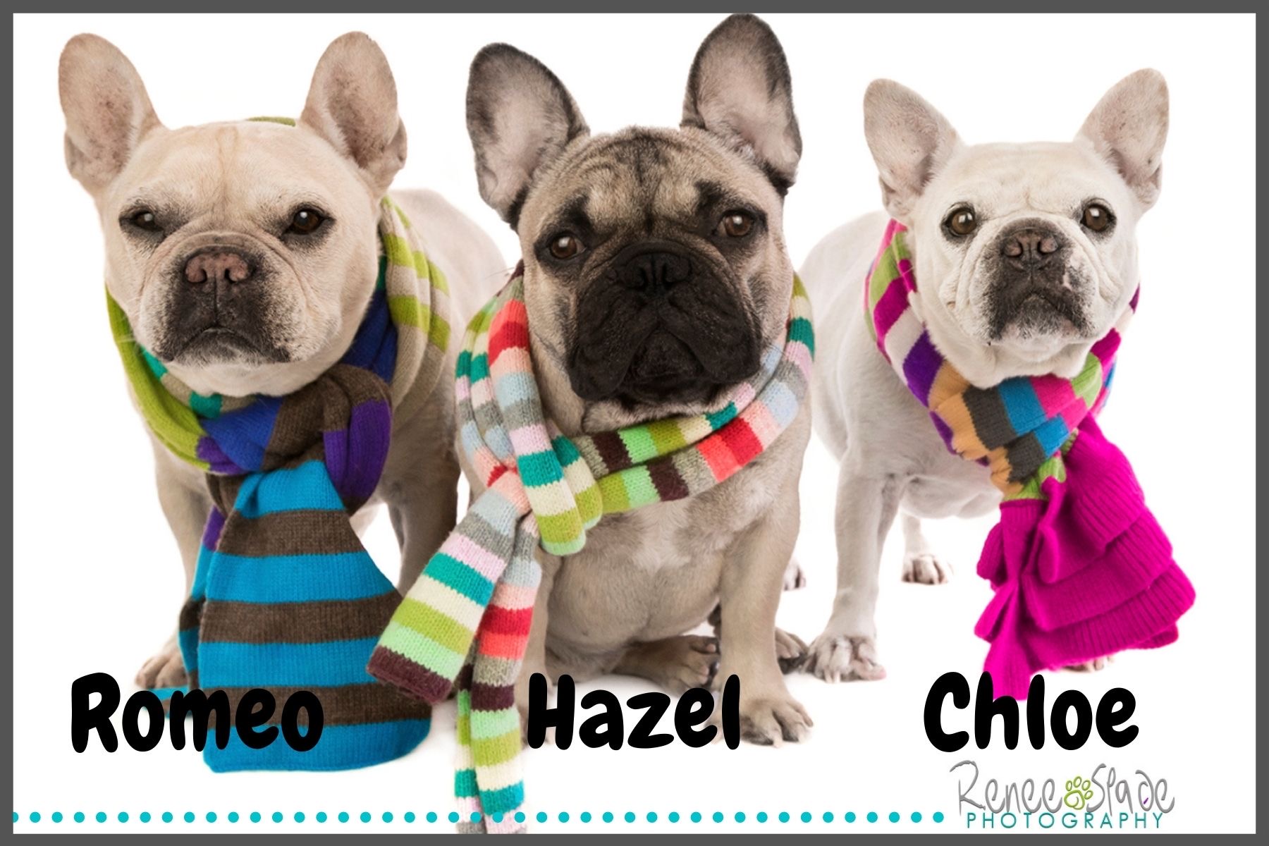 Chloe Morgan was born on November 28, 2007. She was a sassy little girl that loved to sing…yes, that’s right. Chloe would start every morning with a beautiful Aria followed by several more songs throughout the day. She enjoyed a wonderful life with 7 siblings and many foster dogs throughout her lifetime, however she always let them know who was the boss! Chloe was also the Brand Ambassador of Frenchie’s Kitchen Human Grade Dog Food. She was a real “foodie” and served as the official Taste Tester for this great company. She was one of the oldest French Bulldogs in the country at the time of her death. We attribute this to her healthy diet and lifestyle. Chloe loved the holidays! Our friends and family were always excited to receive her festive Christmas card each year. As you can see, she LOVED getting her photo taken by our favorite photographer, Renee Spade Photography!